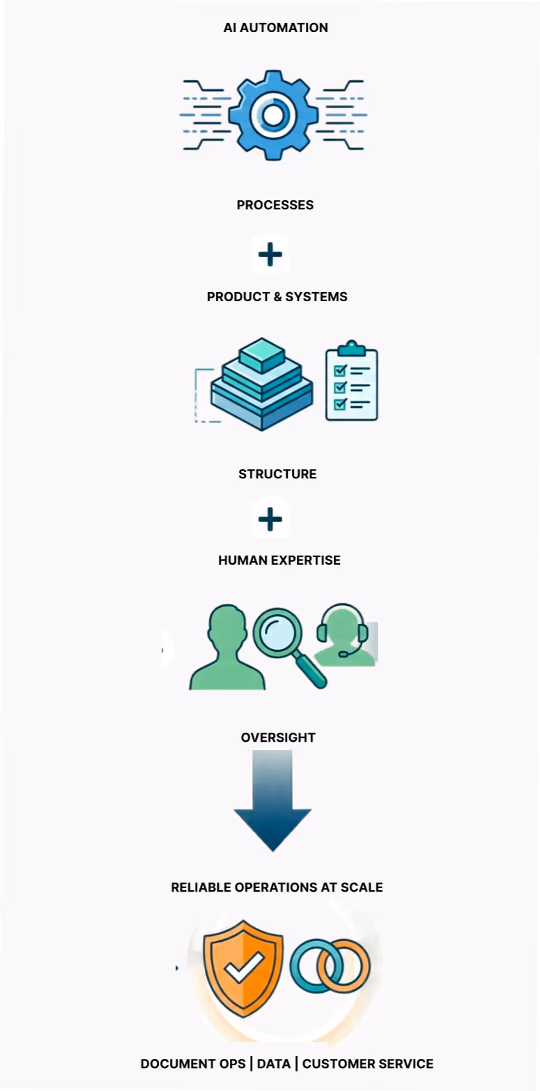 By combining AI automation, structured operational platforms, and human expertise, we help leadership teams scale operations without increasing complexity.